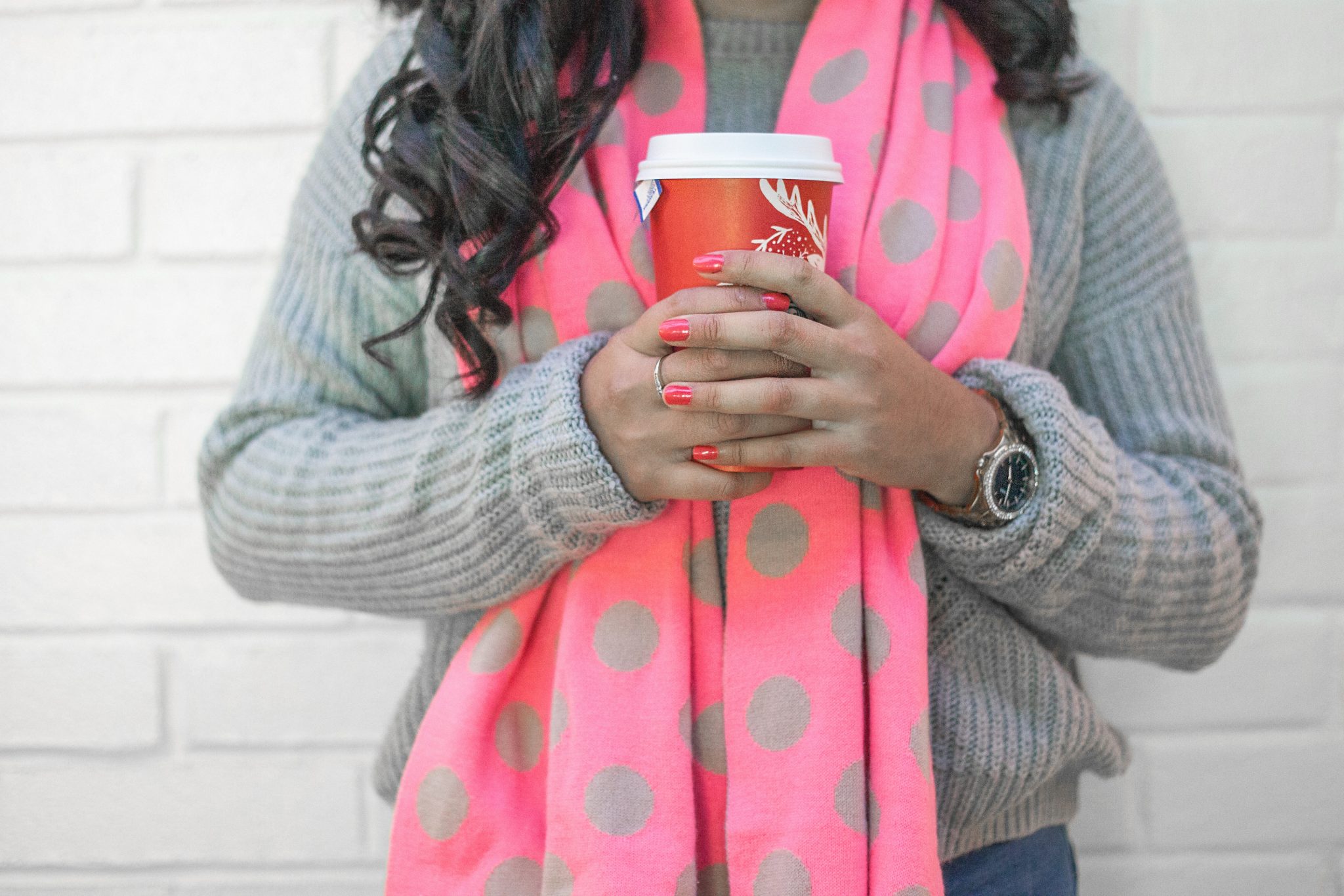 Accessorizing this look is key! I knew I had to bring out my old pink polka dot scarf to brighten up this look and when I wanted to tone down the look, I took out the scarf and replaced it with pink toque. There you go, I had a couple of different looks without even replacing a lot of items on my outfit.