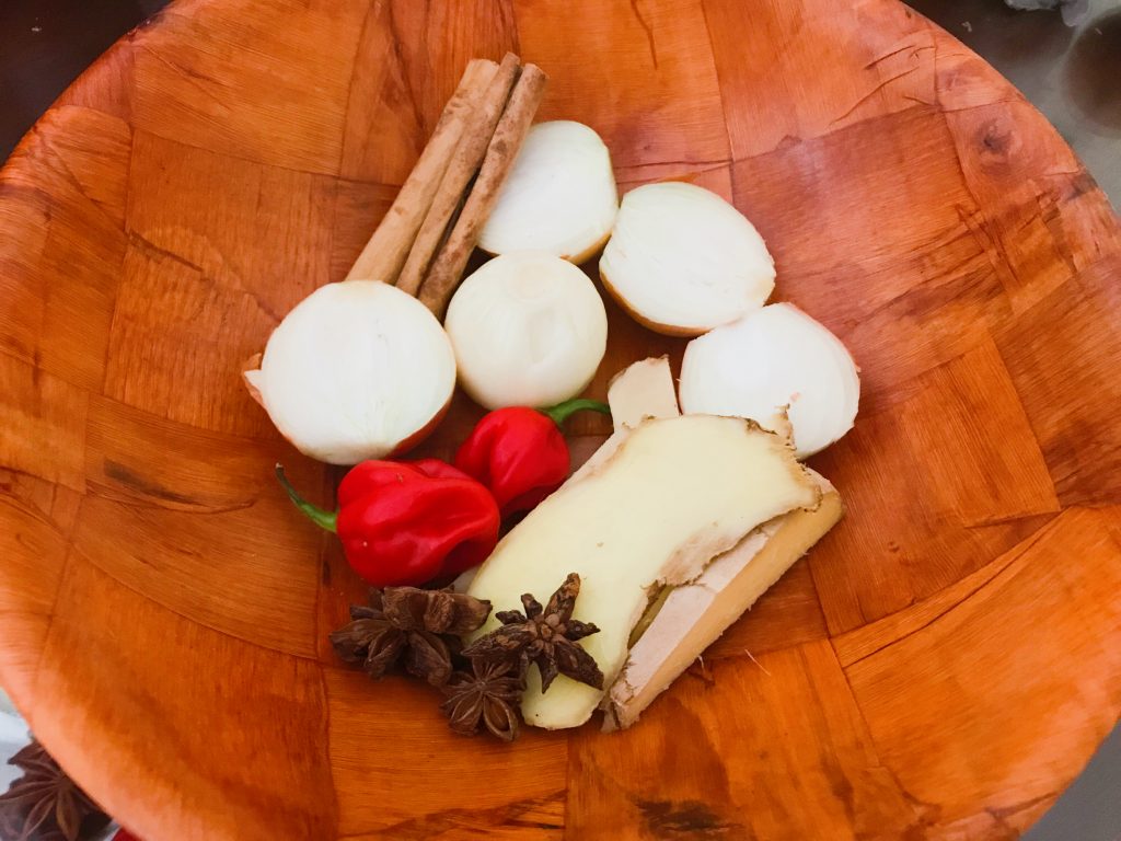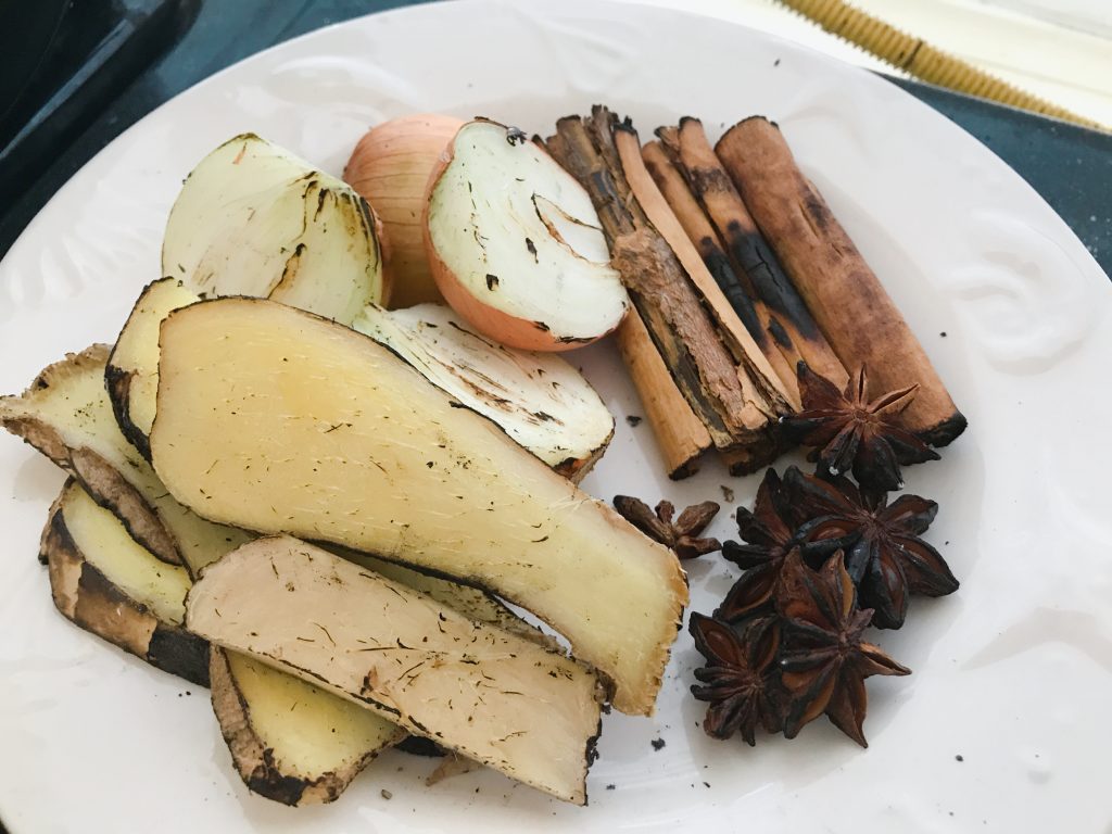 3. While your beef bones and flank steak are in the process of boiling, grill the star anise, cinnamon, ginger, onion for aroma using your stove top and put the spices aside*. Brace yourself because the aroma of the spices are beyond this world. It will honestly make you want to cook pho every week. Grab empty tea bag filters and put the grilled spices inside. You may have two or three filled tea bags afterward.